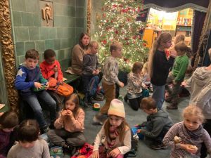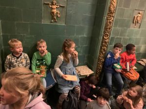 Aufgeregt und erwartungsfroh lauschten die Kinder den Worten des Heiligen Nikolaus, mit bangen Blicken musterten die Kleinen seinen Begleiter. Schnell wich die ein oder andere Unsicherheit einer frohen Stimmung, waren die Worte des Nikolaus doch voller Lob und wenig Tadel. Es durften immer zwei/drei Kinder nach vorne kommen und den Stab halten, was sich alle mutig zutrauten, während der Heilige aus seinem Buch über sie vorlas und mit ihnen sprach. Sogar für Frau Frick hatte er ein paar Worte des Lobs, ermahnte sie aber auch, die Namen der Kinder nicht so oft zu verwechseln.