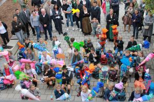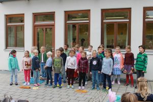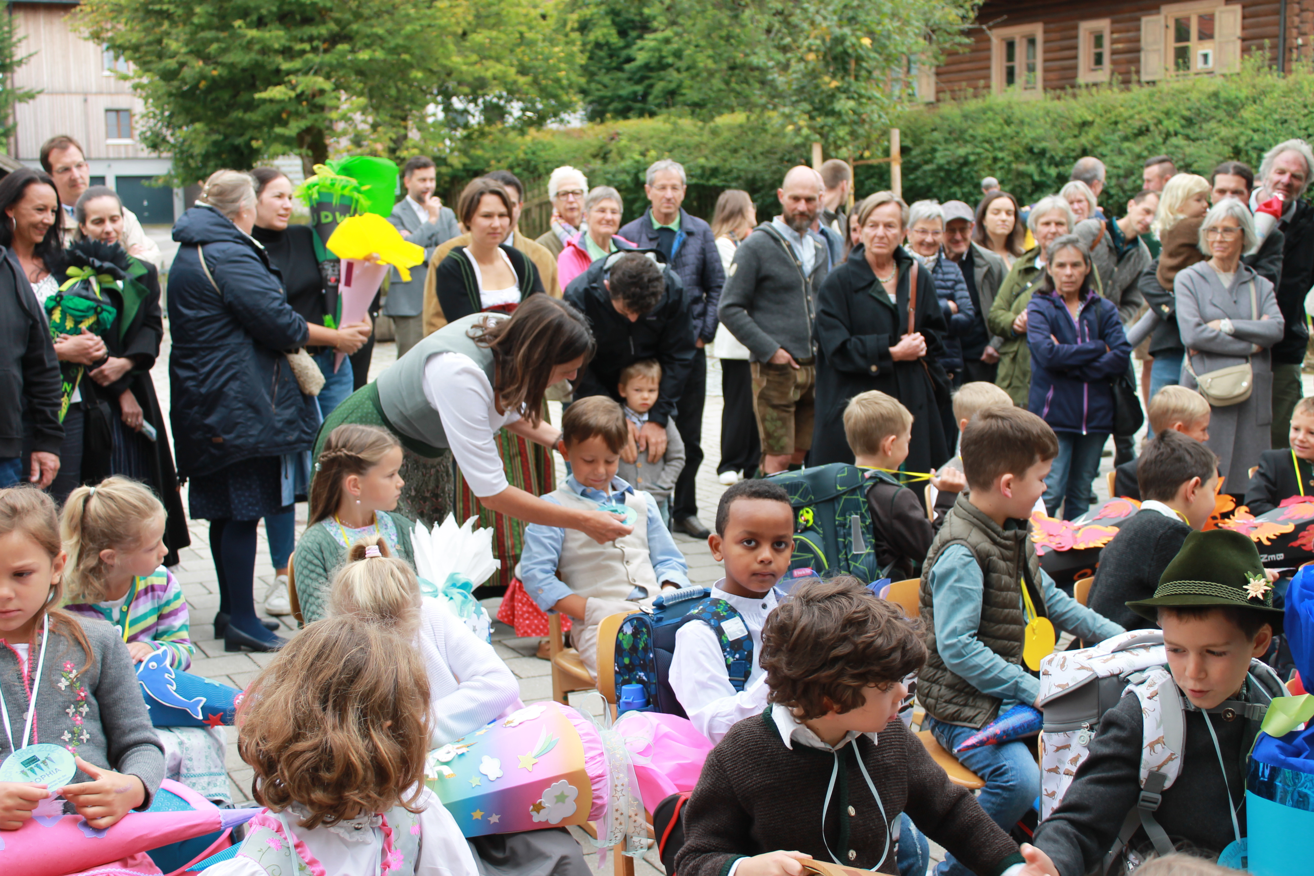 Bei trockenem Wetter fand der Empfang auf dem Pausenhof statt. Rektorin Christine Haberl begrüßte die neuen Erstklässlerinnen und Erstklässler herzlich. Die Zweitklässler sangen ein Willkommenslied, bevor die Kinder von ihren Klassenlehrerinnen eine Schulkindmedaille umgehängt bekamen.